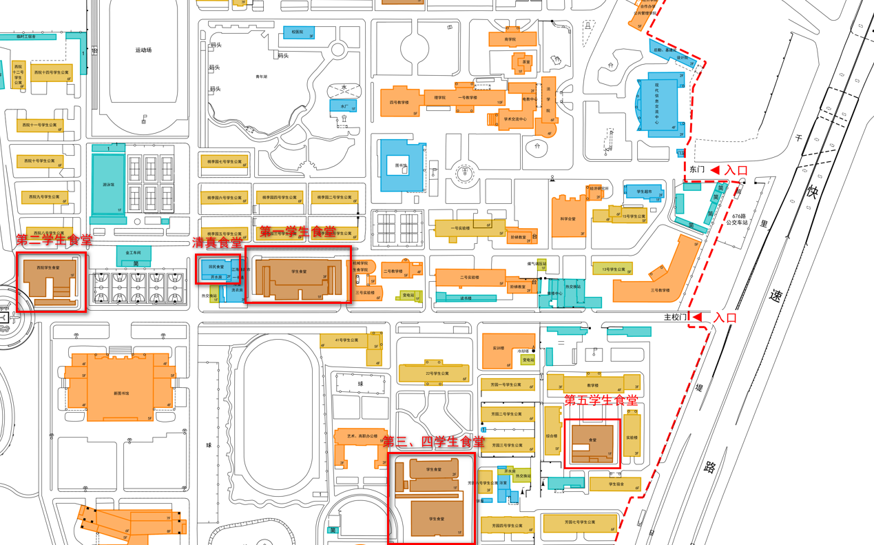 校内食堂:第一员工食堂、第二员工食堂、第三员工食堂、第四员工食堂、第五员工食堂、清真食堂