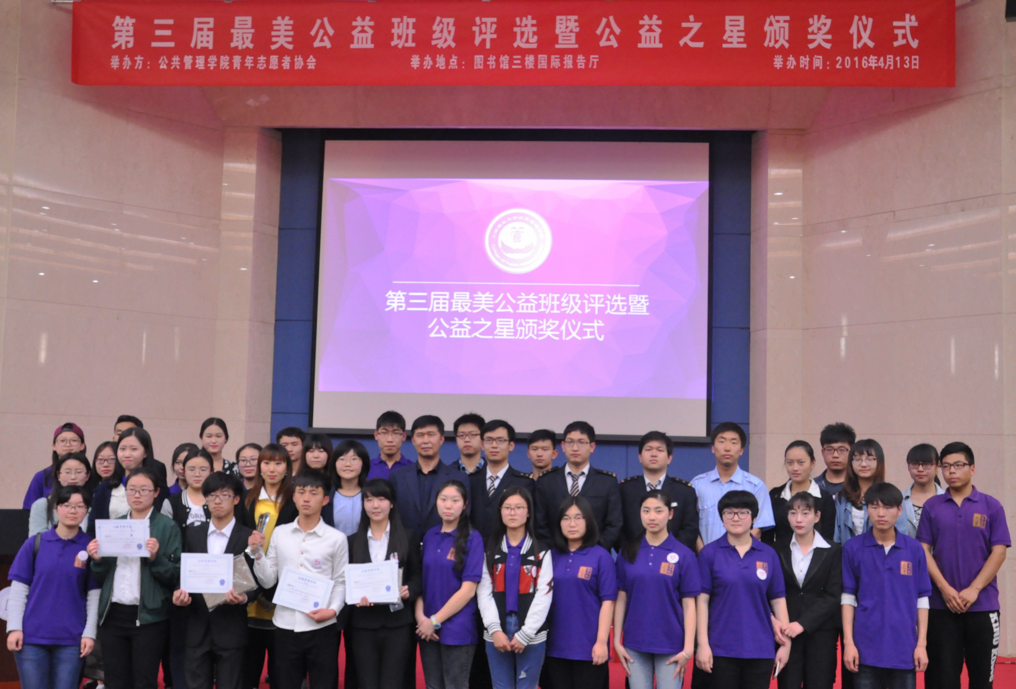最后,嘉宾为曾琼雯等10名公益之星、刘丹丹等10位公益达人颁奖。公管1510班、公管1505班、会展1502班、会展1501班、公管1504班分别获得最具风采展示公益班级、最具实践意义公益班级、最具发展潜力公益班级、最具创新价值公益班级、最具调研价值公益班级,公管1501班夺得桂冠,获得年度最美公益班级称号。