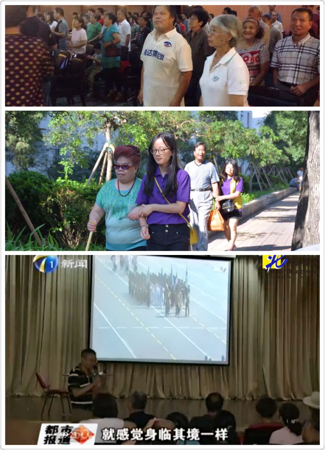 在“听”阅兵式前,志愿者团队将暑期实践所收集的“把我的家乡,带给你听”活动的一百份精选录音材料及百首世界经典古典乐曲录音捐赠给文化宫,由文化宫老师分发给与会的盲人朋友。阅兵式由文化宫副馆长郑伟进行讲解,他用生动形象的比喻让盲人朋友们感受到了阅兵式宏伟、壮观的场景。当国歌响起的那一瞬间,盲人朋友们全体起立。一场别样“听”阅兵式活动,让全体志愿者也受到一次爱国主义教育。每日新报及天津有线电视台等媒体对此次活动进行了采访报道。