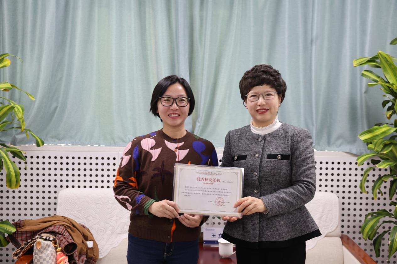 王立云代表公司对吴弦返校表示热烈欢迎,充分肯定了员工在传媒行业深耕多年取得的成绩,对她支持母校发展和公司建设的实际举措表示衷心感谢。会上,王立云为吴弦颁发“优秀员工”证书,并赠送在学资料纪念卡。